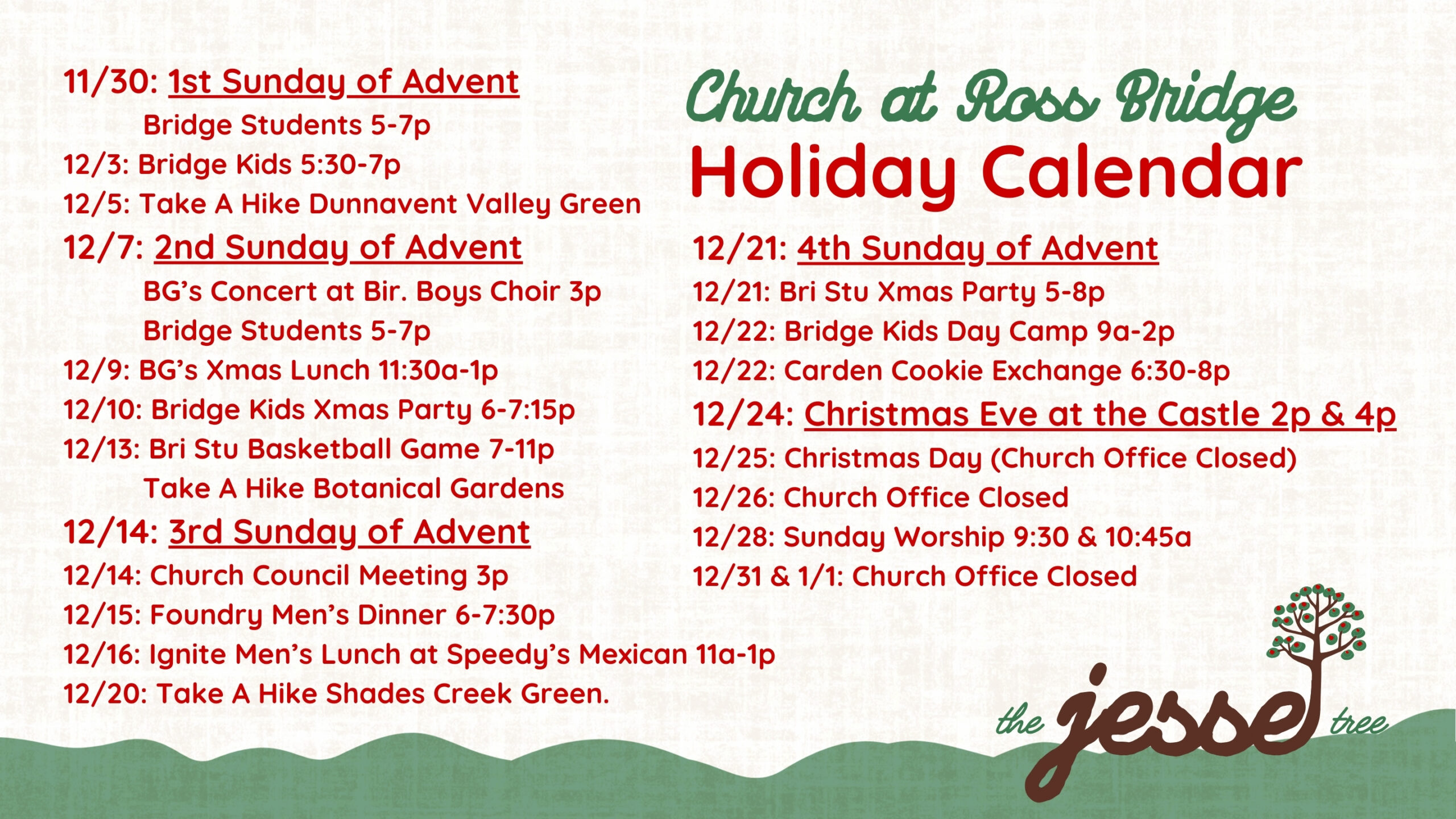 Days Hours Minutes Seconds LIVE ConnectEventsConnectHoliday Ministry CalendarClick to see and save our holiday ministry calendar!Advent Daily DevotionalEnjoy our Jesse Tree Daily Devotional!Christmas Eve at the CastleClick to register for our 2p or 4p Christmas Eve Services at Ross Bridge Resort Hotel!Spiritual Gifts AssessmentIf you are joining our church or just want to learn more about God's gifts in you, in just 15 minutes, you can discover your spiritual gifts (with DISC Profile) and begin receiving personalized guidance that will transform your walk with Christ!Rejoice Anyways Guest Speaker Workshop SeriesConstruction UpdatesInformation & Updates on our New Construction Project!NEWSLETTERStay Informed & Get Connected with Our Bi-Monthly Newsletter!Sponsor A Mount Chapel BenchComplete this form to sponsor a bench (With Honorarium/Memorial Plaque) at Mount ChapelDownload our Church AppTo access My Church App: 1) Download “My Church” App in App Store 2) Locate Church at Ross Bridge in “Find my Church by Name” 3) Once connected, tap the Profile icon in the top right corner. Then, enter your phone number to sign in.Bridge StudentsClick here for all things Bridge Students! (It's the coolest connect card on this page)Audio Assistance for WorshipIf you use a Hearing Aid or Cochlear Implant(s), this technology will allow you to stream the worship feed directly to your device, through your phone.Hobbies, Skills & Interests SurveyThis is a congregational survey to help us capture the Hobbies, Skills & Interests of people in our church. This not only aids our goal of getting laypersons involved in ministries they are passionate and gifted for, but helps to open doors for connecting folks around interests and the possibility of spiritual formation experiences.Become a Member! #ALLIN2026Join Our Church As a New Member or Re-Commit Yearly as an Existing Member!Become a Christian!Learn more about becoming an Apprenticeship to Jesus Christ through Baptism!Bridge Students InstagramYouTube ChannelCARB InstagramCARB Facebook PageIGNITE Men’s FellowshipCOMPASS: A Discipleship AssessmentBridge Kids Facebook GroupTake A Hike – Women’s Outdoor Adventure GroupAttention Outdoor Adventure Seekers!!! We have 12 gorgeous hikes planned for this Autumn, so grab a friend and let's hit the trails together soon! Click HERE for all the details, and to register!GiveWorship through Giving & Help Fuel our Mission!Watch/Listen to a MessageEvents Dec 7 8:15 am - 9:15 am Worship Service Dec 7 8:15 am - 11:45 am Nursery Dec 7 9:30 am - 10:30 am Worship Service Dec 7 10:45 am - 11:45 am Worship Service Dec 14 8:15 am - 9:15 am Worship Service Dec 14 8:15 am - 11:45 am Nursery Dec 14 9:30 am - 10:30 am Worship Service Dec 14 10:45 am - 11:45 am Worship Service Dec 21 8:15 am - 9:15 am Worship Service Dec 21 8:15 am - 11:45 am Nursery View Calendar